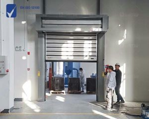 常州森萨塔选用的快速卷帘门是作为车间隔断使用,由于通道空间比较小,采用的是前置电机的快速卷帘门。前置电机快速卷帘门主要结构和常规的快速卷帘门不一样。电机是朝前凸出来的,这样快速卷帘门有电机一侧占用空间就很小,差不多12厘米。常州森萨塔为了安全起见给快速卷帘门配了安全光幕以及限制人员进出的刷卡门禁。这样每个车间就被这道快速卷帘门进行区隔开来,常用在精密加工新车间,电子车间等场所。